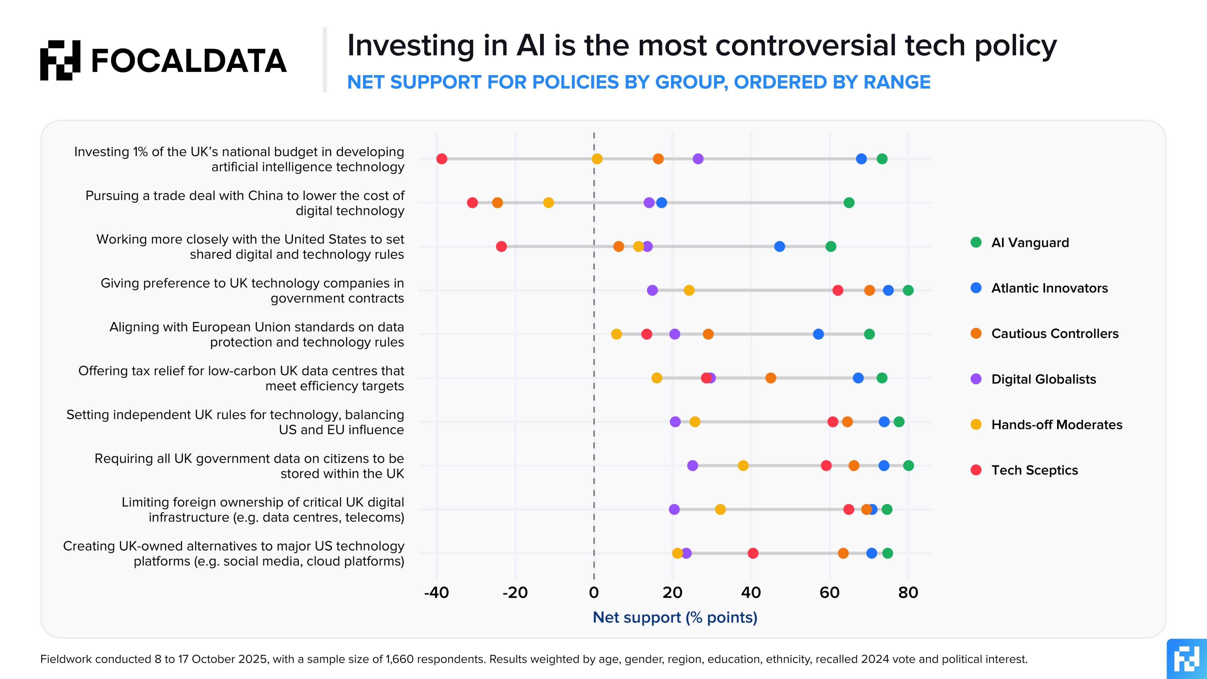 Based on an attitudinal segmentation, we have identified six distinct groups within public opinion, differentiated by their views on technology, AI, and the state’s role in regulation of digital assets. These groups are Atlantic Innovators, Digital Globalists, Cautious Controllers, Hands-off Moderates, Tech Sceptics and the AI Vanguard.