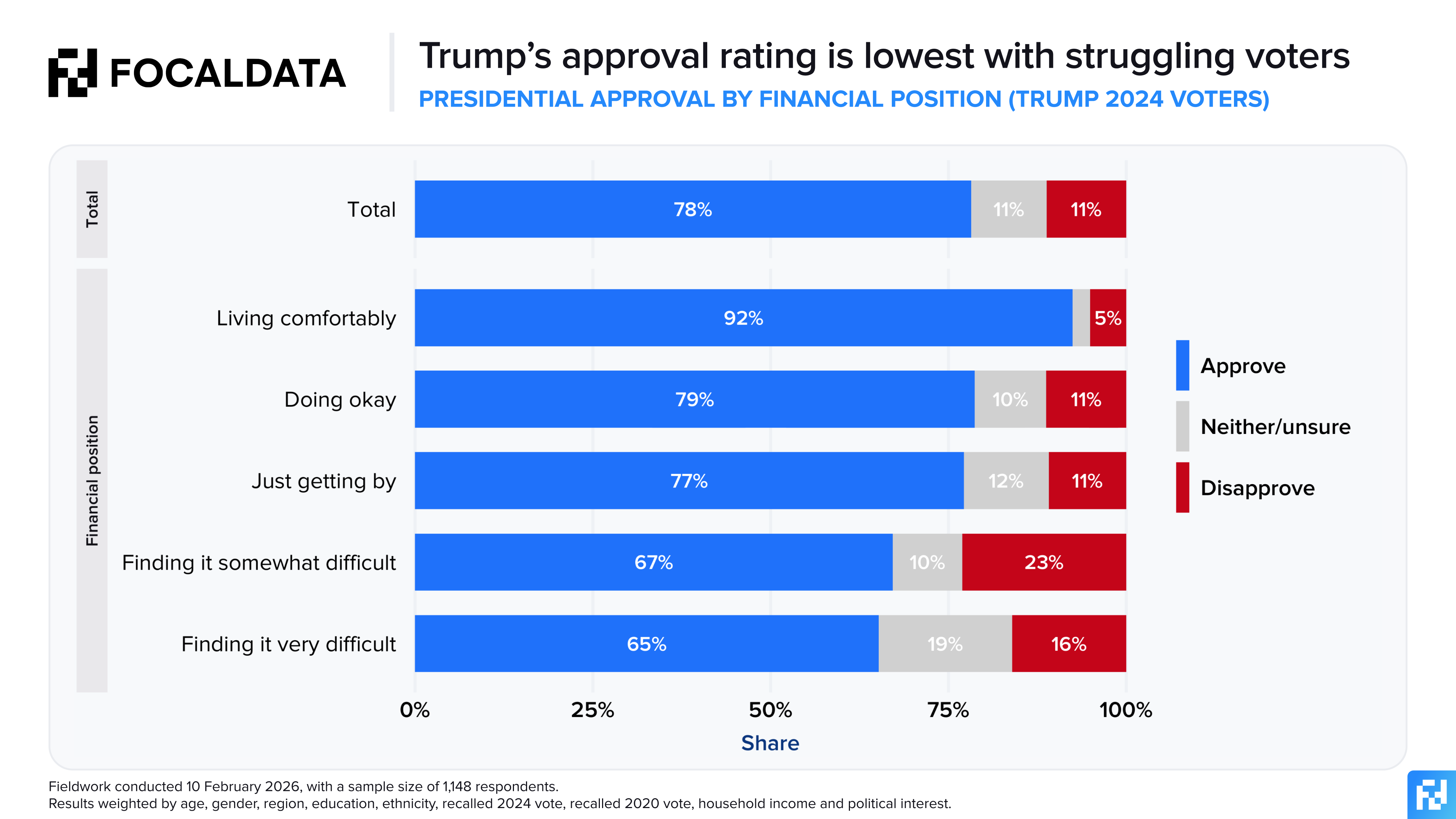 Just 5% of those who voted for Trump in 2024 and are financially comfortable disapprove of his performance, but this rises to around one in five among his voters finding things difficult.