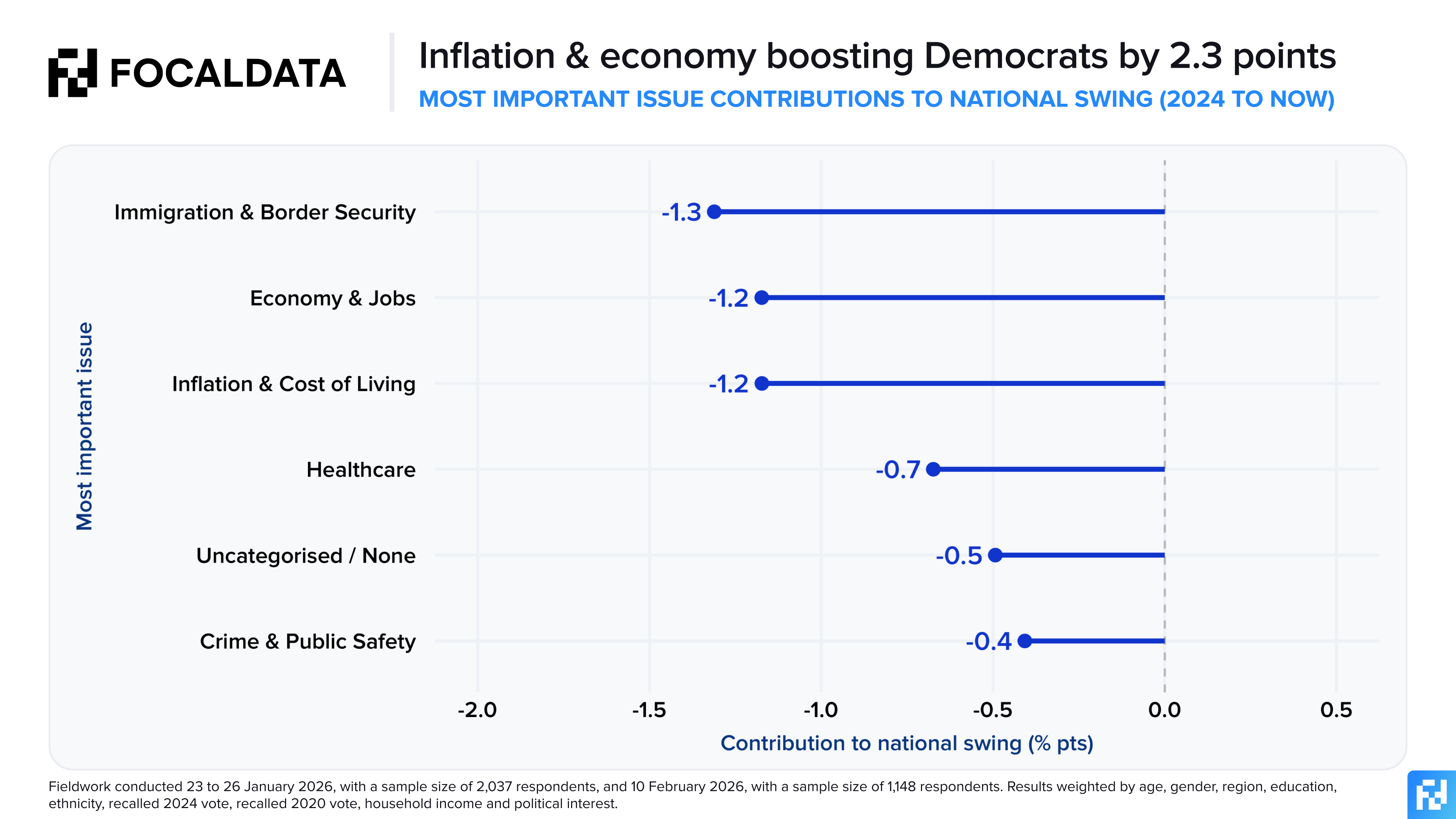 Our modelling also indicates that the economy and cost of living are directly responsible for a 2.3-point shift towards the Democrats since 2024. Put another way, if the Republicans had maintained Trump’s 2024 lead with economy-concerned voters, the Democratic lead in the House ballot would be two points lower. The combined impact of inflation and economic concerns is more than twice the size of any other issue, accounting for around 2.5 million votes in the Democratic direction.