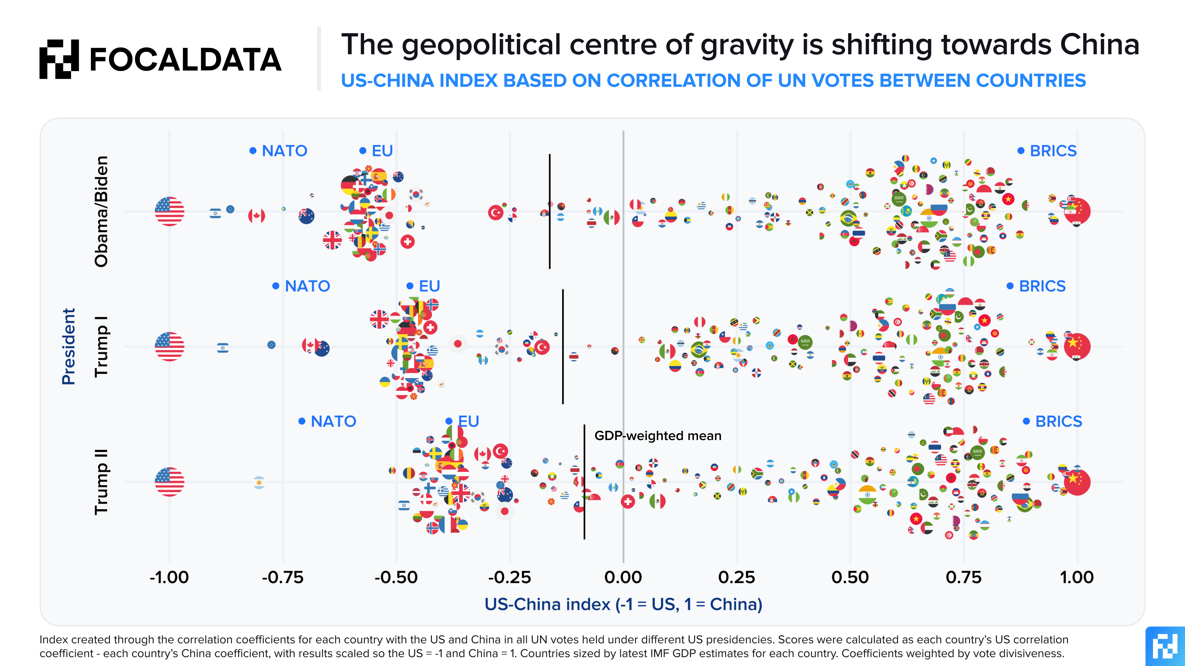 We analysed decades of United Nations voting data and responses to the World Values Survey and have proven empirically that the geopolitical centre of gravity is already shifting away from the United States and towards China, driven mainly by Europe’s increased distance from the US under the Trump presidencies. We also find that Central and South America are likely to have an outsized influence on the future balance of power.