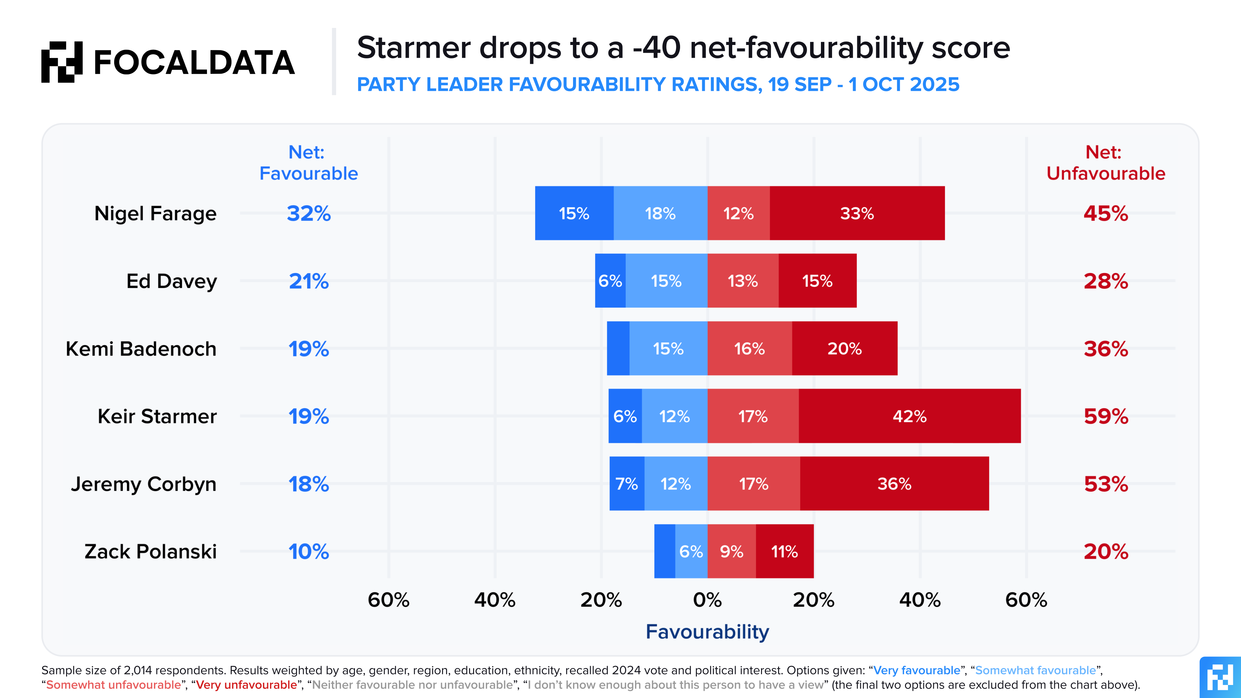 With the conclusion of the Labour Party's annual conference, Keir Starmer has dropped to a net approval rating of -40, the lowest we have recorded at Focaldata. The survey, conducted between 19 September and 1 October, found that 19% of the public has a favourable approval rating of the prime minister, compared to 59% with a negative view.