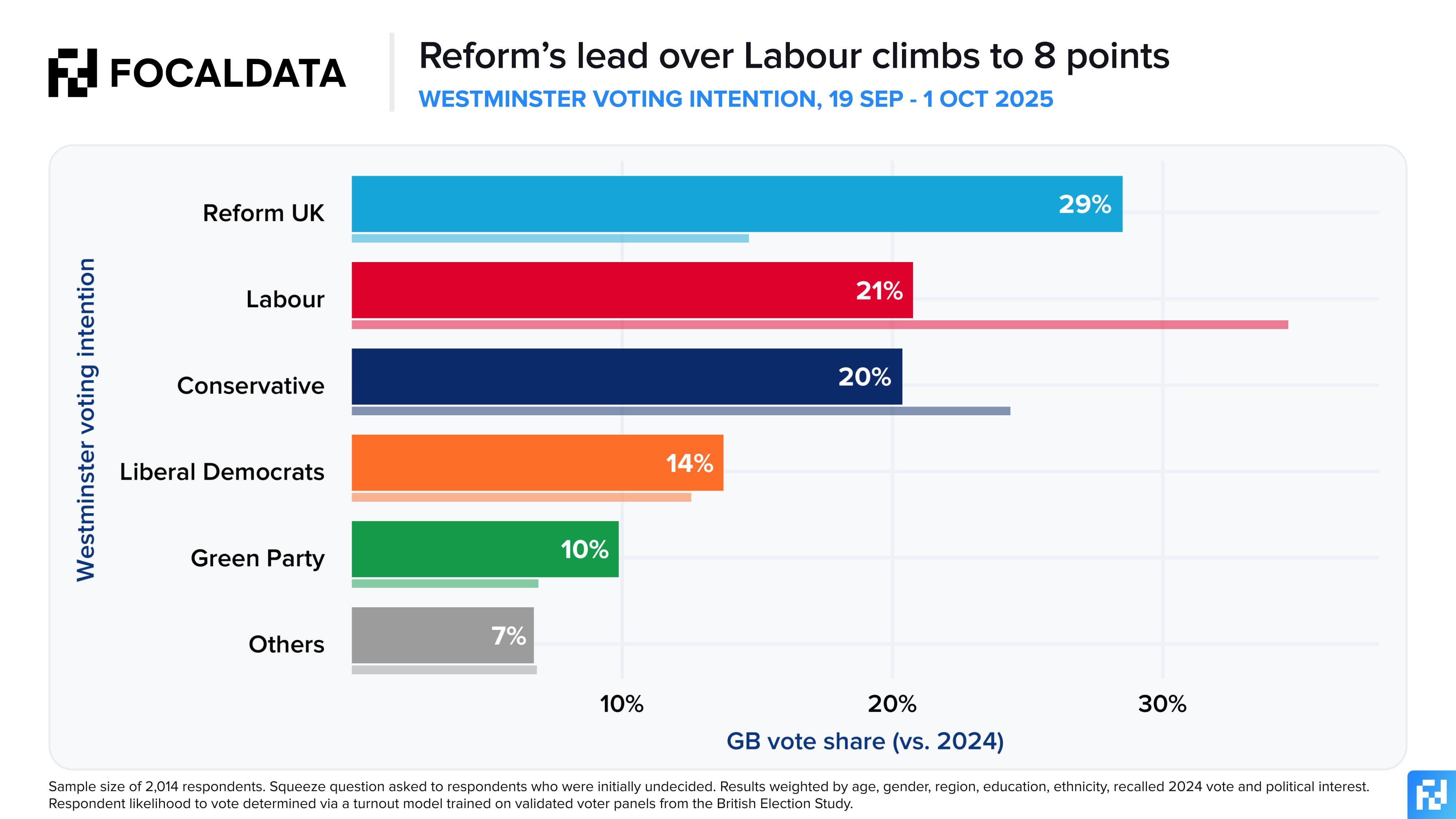 On the voting intention front, Reform UK has increased their lead over Labour to 8 points, up from 5 points in last month’s survey. Nigel Farage's party remains steady on 29%, while Labour has dropped to 21%, down three points on last month.